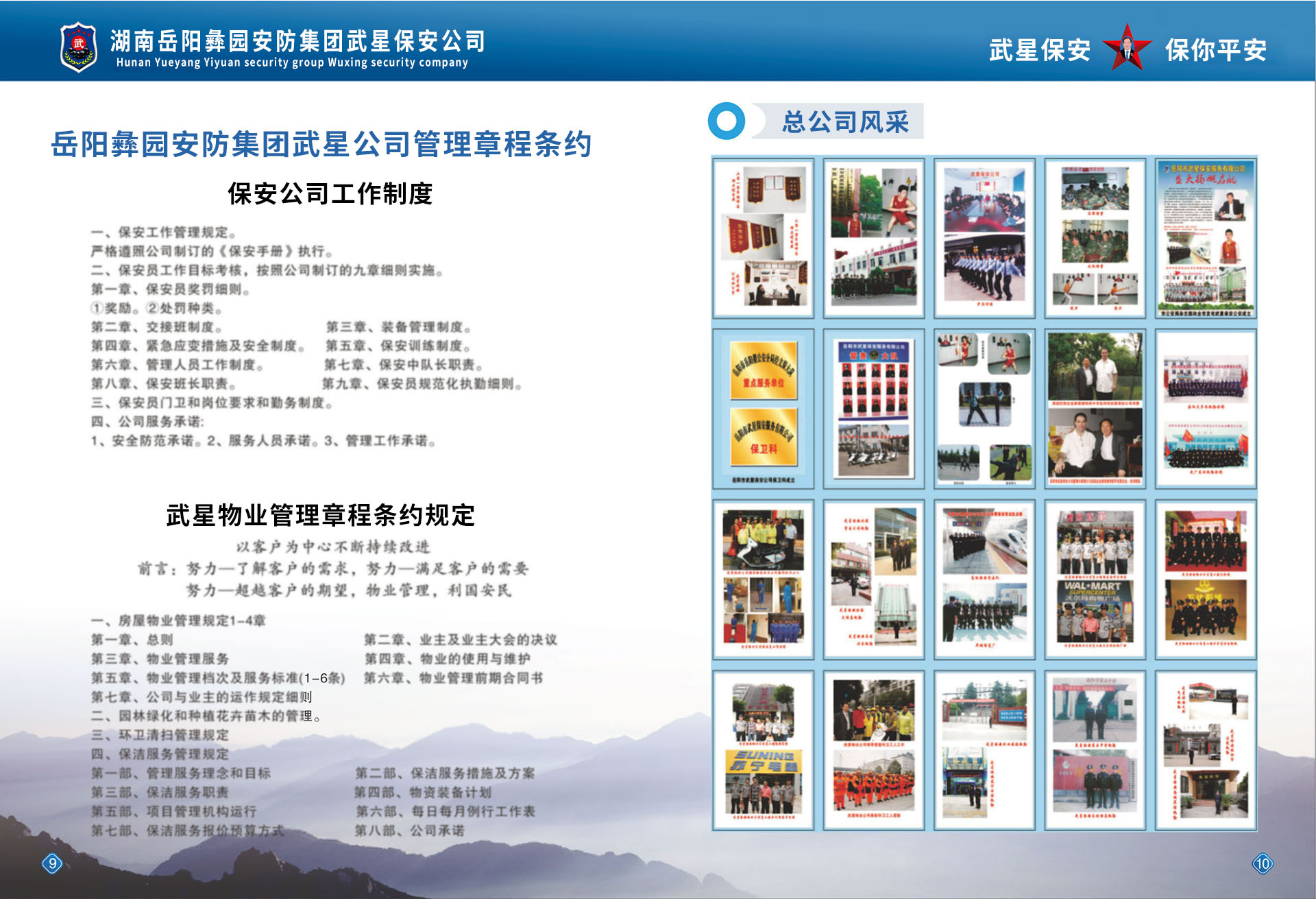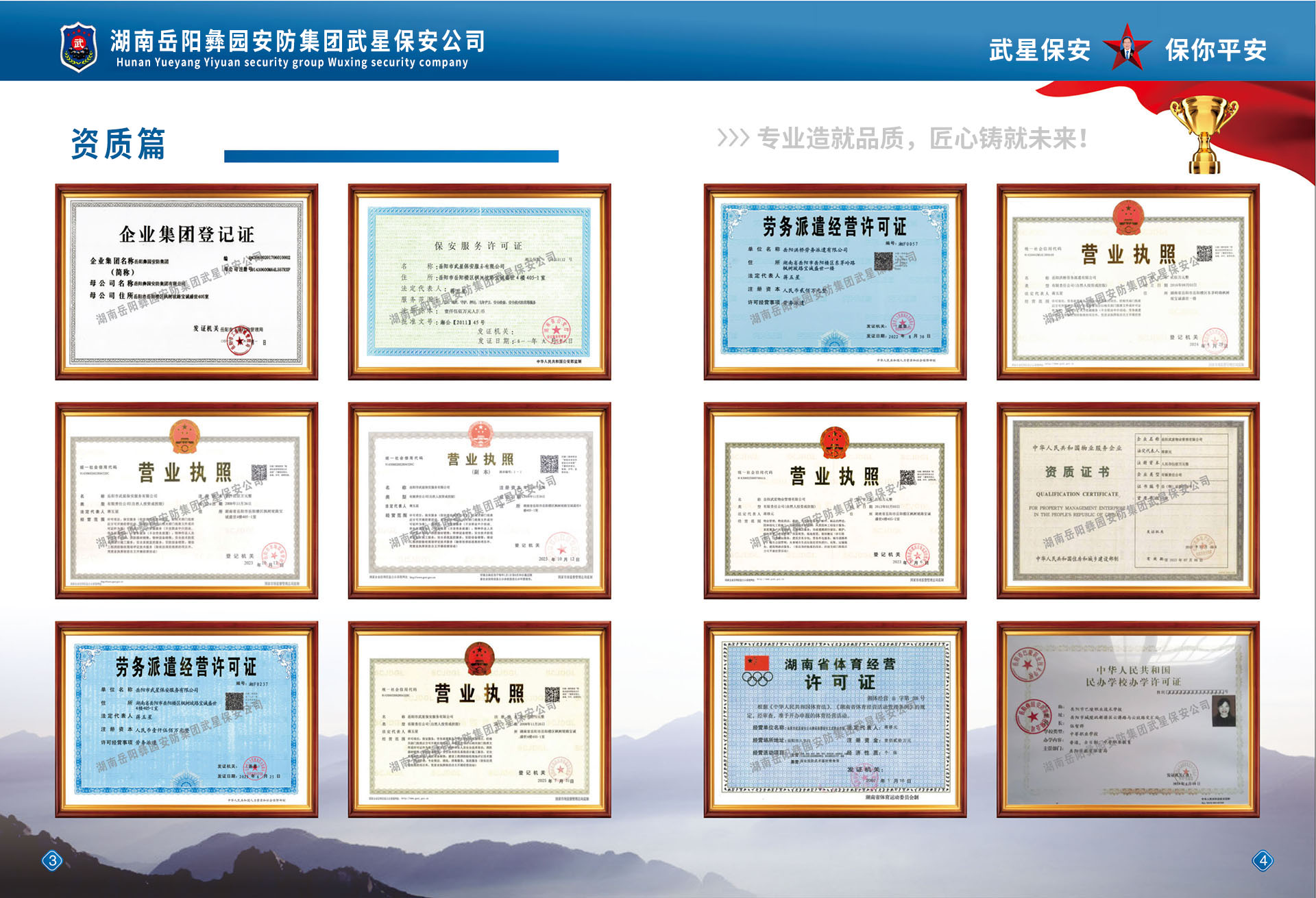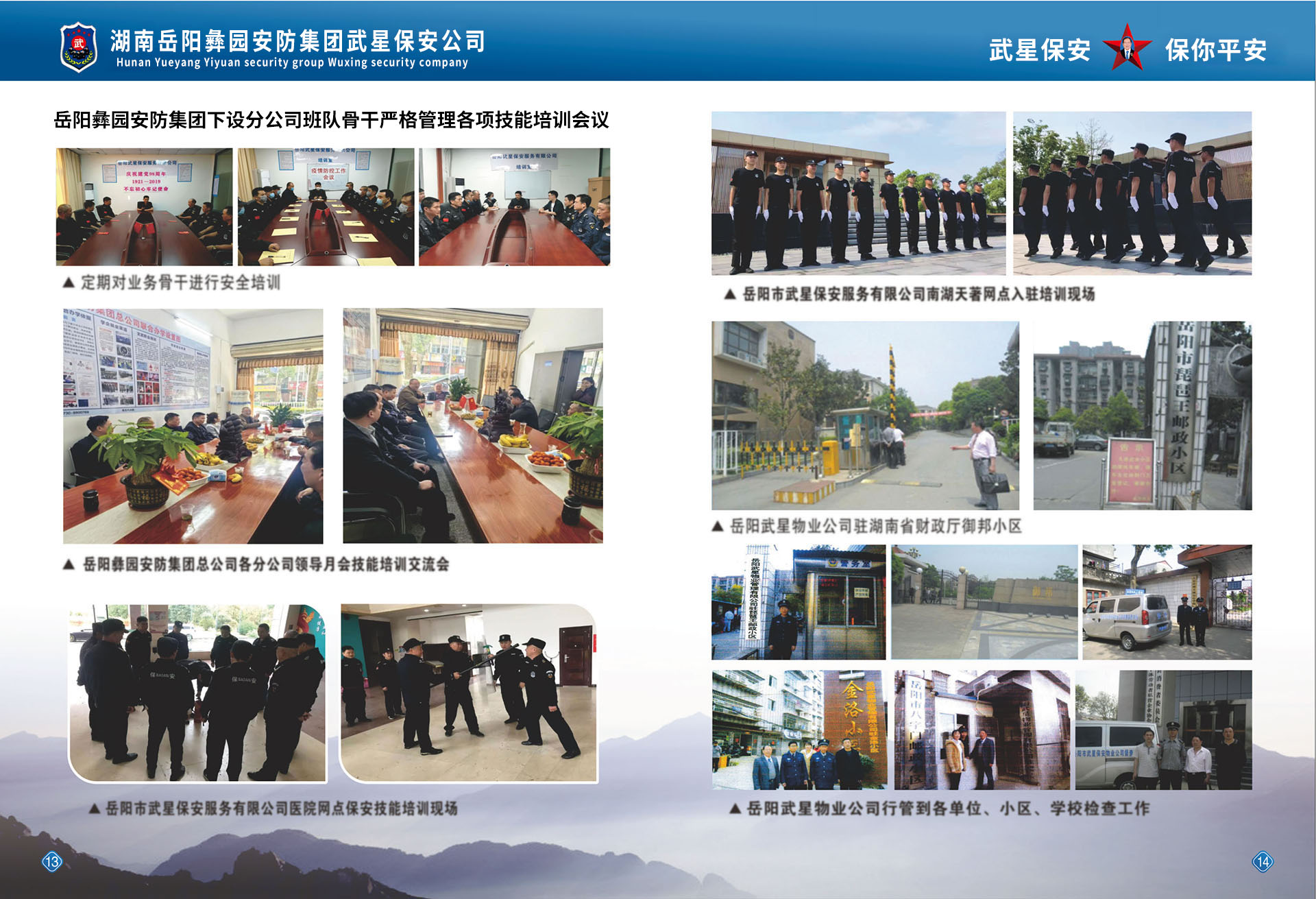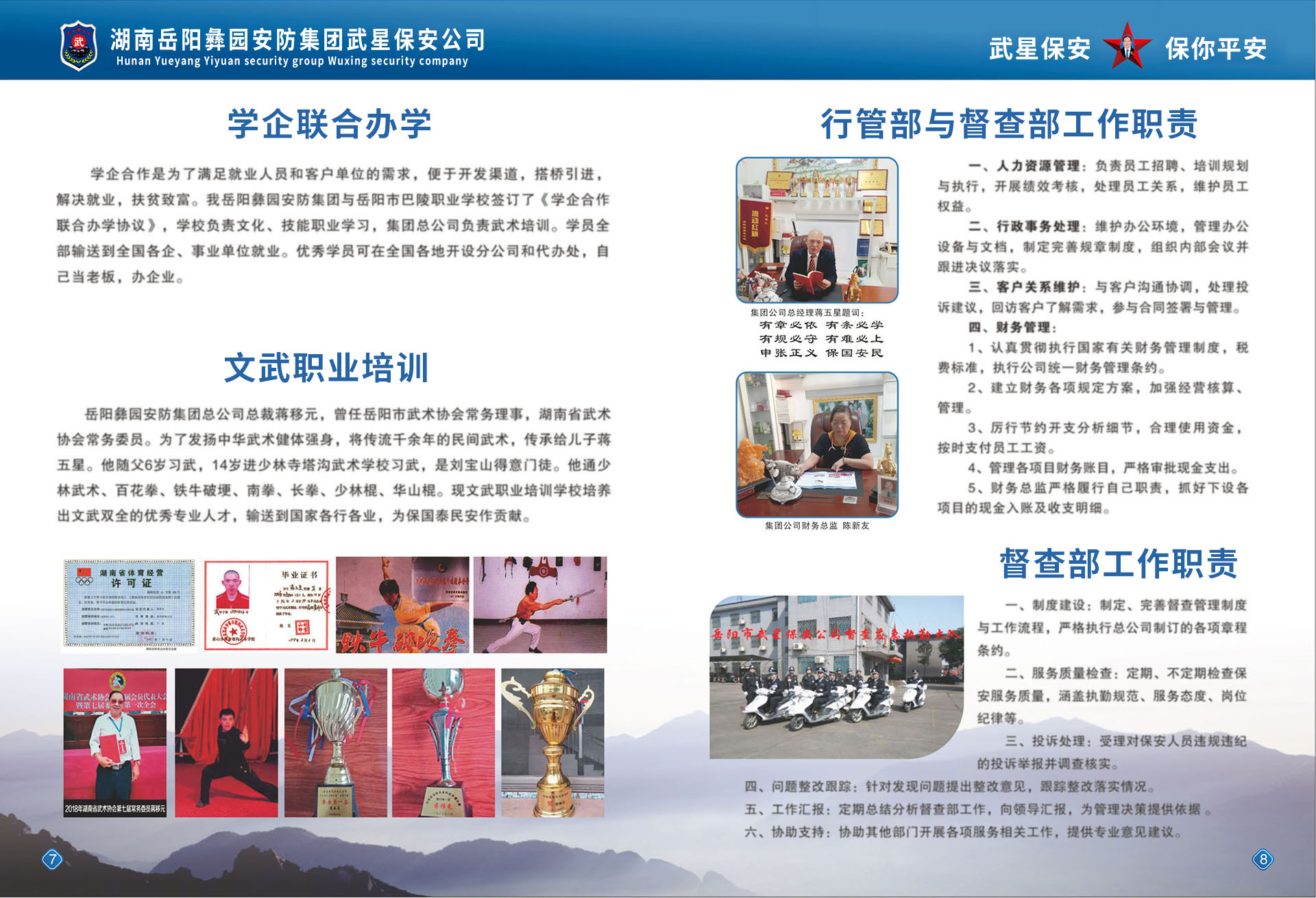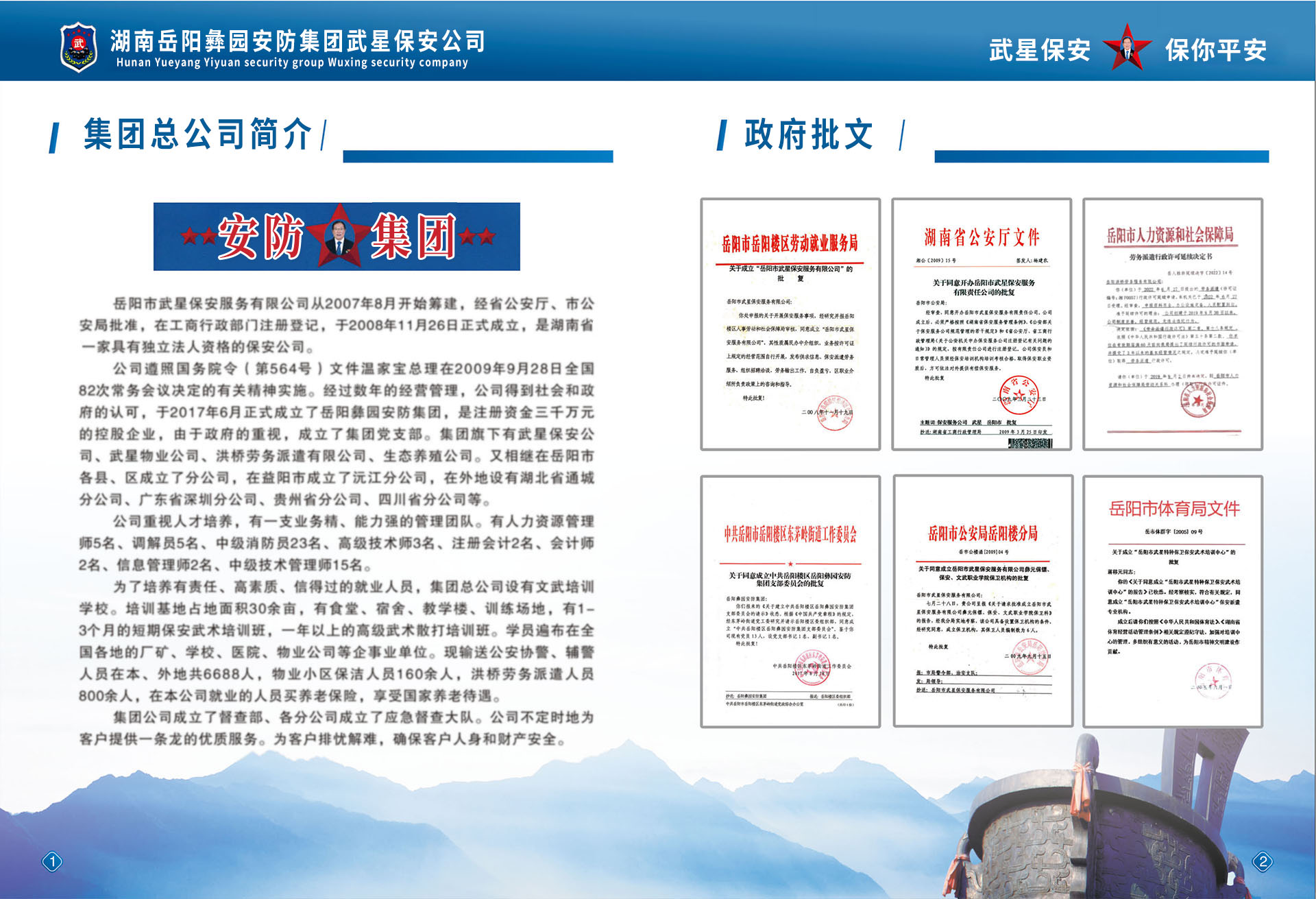 2017年6月正式成立了《岳陽(yáng)彝園安防集團(tuán)》,下設(shè)《武星保安公司》、《武星物業(yè)公司》、《洪橋勞務(wù)派遺公司》、《保鏢保安武術(shù)職業(yè)培訓(xùn)學(xué)?!返茸庸?/p>